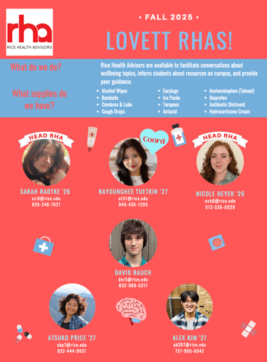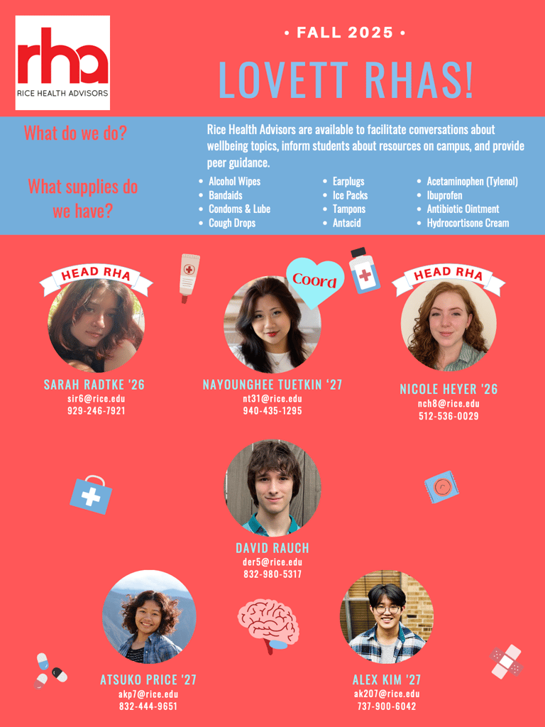 RHAs are students who have been trained on a variety of well-being topics. Their job at Lovett is to provide health education opportunities, health supplies, and peer guidance. RHAs also act as liaisons between the Student Wellbeing Office and the residential colleges, staying up to date on well-being resources across campus.